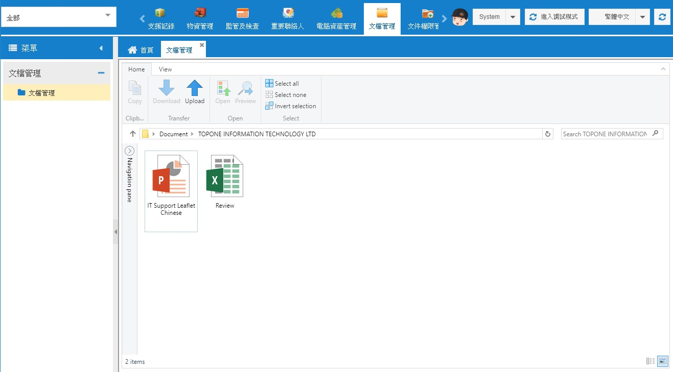 [文檔管理]是一个供客户管理公司的文件和工具的数据库,客户可以在cs.topone.hk 系统上存放各种文件,由公司常用文件以至计算机系统的保养数据,若果员工外出工作或到外地公干时,他/她可以登入到系统上并存取数据,甚至万一重要文件遗留在公司计算机时,员工亦可以将公司计算机上的活页夹同步在此工具中,即使在外出与客户开会时,亦可以随时打开所需文件。